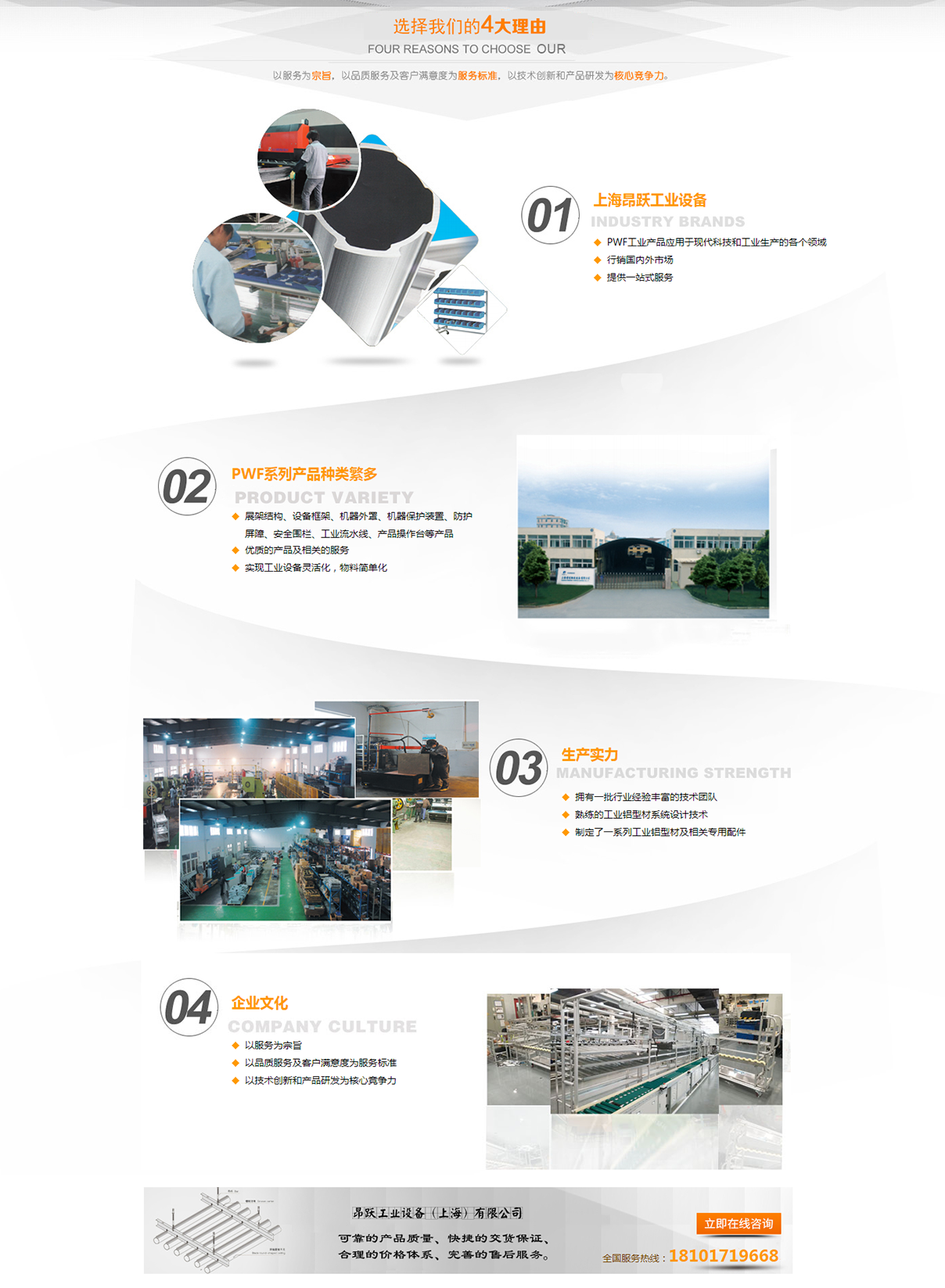 昂躍工業(上海)有限公司于2012年成立以來,我們秉承以服務為宗旨,以品質、服務及客戶滿意度為服務標準,以技術創新和產品研發為核心競爭力。從產品的模具設計研發到擠壓生產,從產品精加工到表面處理,從簡單的鋁型材框架加工到全自動流水線裝置系統化制造,我們以曾經和正在為各行業翹楚公司提供產品和服務為驕傲!